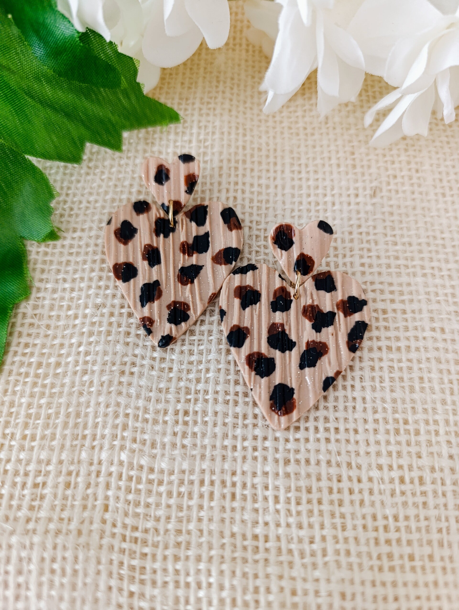 Façonnées à la main en pâte polymère, ces boucles d’oreilles mêlent un motif léopard délicat à une teinte sable doré, rappelant la lumière d’un soleil couchant sur les dunes.
