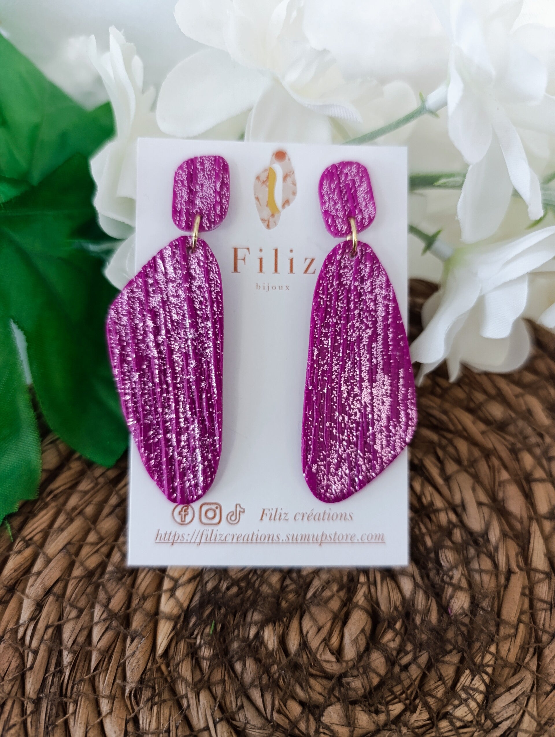 Leur teinte fuchsia métallique, à la fois audacieuse et féminine, évoque la brillance d’une étoile en fusion. Les contours irréguliers rappellent les ondulations d’une dune sculptée par le vent, offrant un équilibre entre force et douceur.