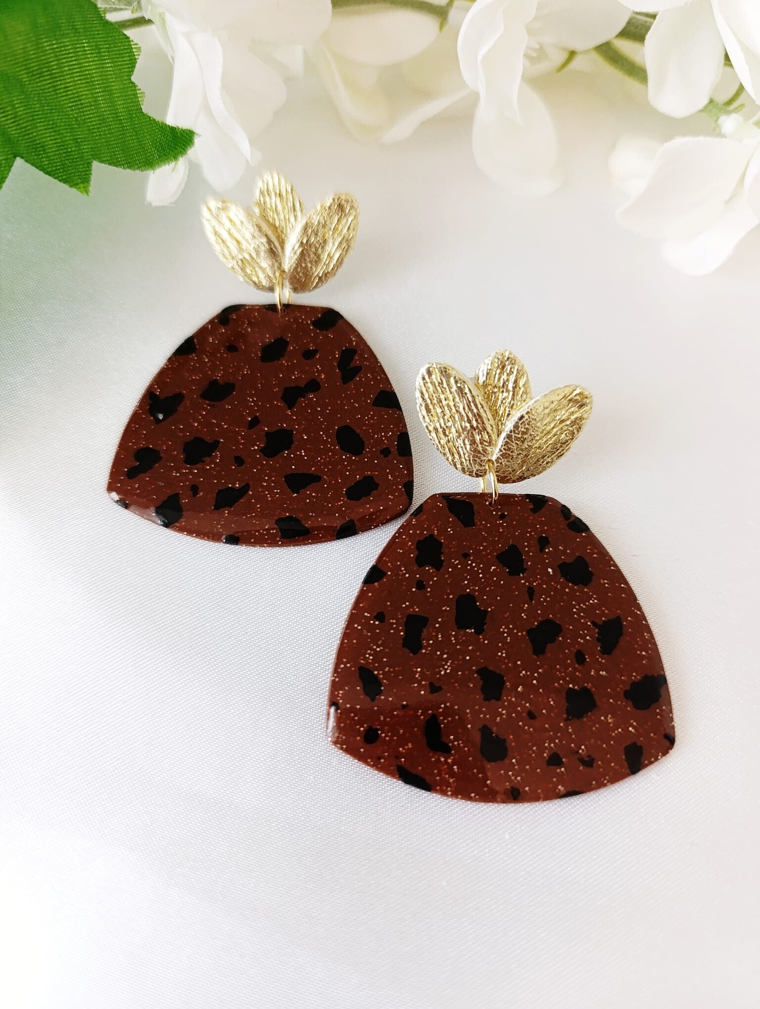 Façonnées à la main en argile polymère, elles révèlent un brun châtaigne gourmand, rehaussé de motifs noirs irréguliers et de micropaillettes dorées, rappelant la texture d'une écorce chauffée au soleil ou d’un grain naturel précieux.
