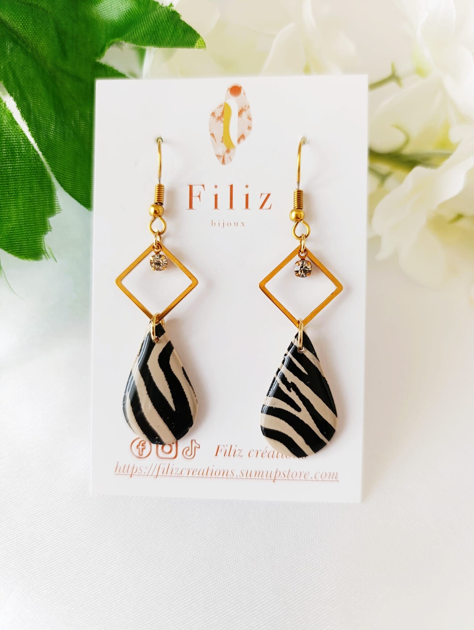 Façonnées entièrement à la main en argile polymère, elles arborent un motif zébré noir et sable, évoquant les empreintes animales, les terres sèches africaines et l’élégance instinctive de la faune sauvage.